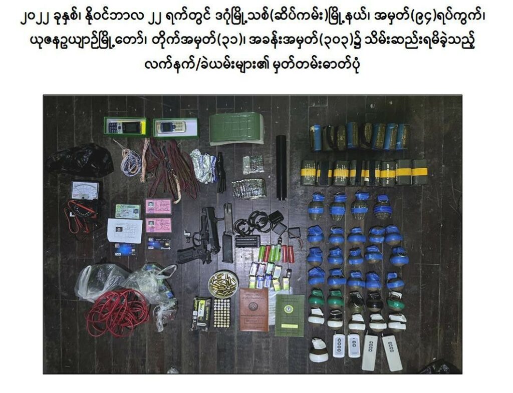 ဖြစ်စဥ်၌ ပြစ်မှုကျူးလွန်သူ ၅ ဦးအား ပစ္စတိုမျိုးစုံ ၃ လက်၊ ၆ လုံးပြူး ၁ လက်၊ ကျည်အိမ်မျိုးစုံ ၆ ခု၊ကျည်မျိုးစုံ ၁၅၂ တောင့်၊အသံတိတ်ပြောင်း ၁ ခု၊ လက်ပစ်ဗုံးမျိုးစုံ ၃၃ လုံး၊ရှေ့ထွက်မိုင်း ၁ လုံး၊ TNT ယမ်းတောင့် ၁၆ တောင့်၊ဒီတိုနေတာ ၁၀၀ ချောင်း၊ဖောက်ခွဲရေးဆက်စပ်ပစ္စည်းများနှင့်အတူ ဖမ်းဆီးရမိခဲ့ပြီး မင်္ဂလာတောင်ညွှန့်နှင့်တာမွေမြို့နယ်တို့တွင် လုပ်ကြံသတ်ဖြတ်မှုများနှင့်ဖောက်ခွဲဖျက်စီးခဲ့မှုများကိုလည်း ဖော်ထုတ်သိရှိခဲ့ရသည်။
