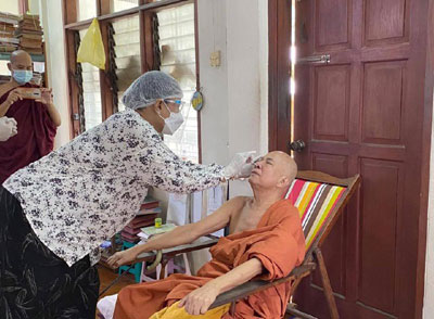 ဗဟန်းရွှေကျင်ကျောင်းသစ်ရှိဆရာတော်များကို ကိုဗစ်ရောဂါစစ်ပေးခဲ့တဲ့ ပိုးကြာဖြူခင်တို့ သားအမိ
