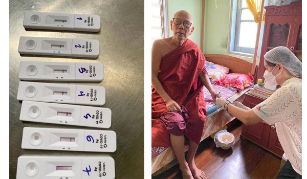 ” ဒီနေ့ ကျမတို့ သားအမိ ၂ ယောက် ရဲ့ ကျန်းမာရေး လုပ်အားပေး အလှူ  ကျမ အမေ သူနာပြု ဆရာမကြီးနဲ့ အတူ ဗဟန်း ရွှေကျင်ကျောင်းသစ်ရှိ ဆရာတော် သံဃာတော်များနှင့်တကွ ဘုန်းကြီးကျောင်းရှိ သူများအားလုံးကို Covid-19 စစ်ပေးခဲ့ပါတယ် အောက်စီဂျင် လိုအပ်နေတဲ့ ဆရာတော်ကြီး အတွက်လဲ အမြန်ဆုံး ရှာပေးနေပါတယ်  Covid test ကိုတော့ Made in Korea VERI-Q Mico Biomed တံဆိပ် သုံးပါတယ်  Test kit ဝယ်လိုသူများ Pk’s Collections မှာ ဆက်သွယ်ဝယ်ယူလို့ ရပါတယ် ဘုန်းကြီးကျောင်းများ ၊ သီလရှင်ကျောင်းများ ၊ ပရဟိတ အသင်းများ ၊ ပရဟိတ ဂေဟာများ အနေနဲ့ ကိုဗစ်စစ်ဆေးလိုလျှင် ဆက်သွယ်ပေးပါ test kit များကို လက်ကားစျေးအတိုင်း စျေးလျှော့ပြီး ရောင်းပေးပါမယ် ကိုယ်တိုင်လဲ အခမဲ့ လိုက်စစ်ပေးပါမယ်ရှင့်  အားလုံးပဲ ကိုဗစ်အန္တရာယ် မှ လွတ်မြောက်ကြပါစေ  “လို့ရေးသားထားပါတယ်။