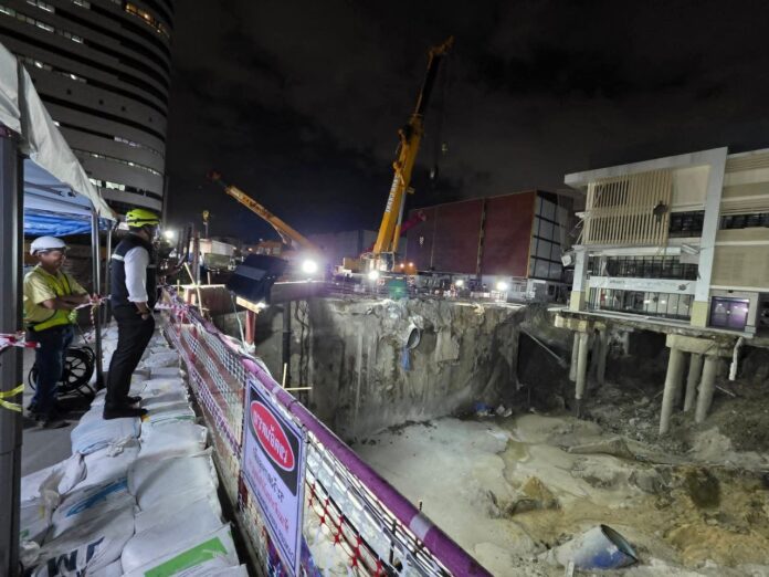 မြေအောက်ရထား MRT (Mass Rapid Transit Authority of Thailand) တာဝန်ရှိသူများနှင့် ကန်ထရိုက်တာများက ဧရာမ တွင်းကြီးအတွင်း လက်ကျန်အပျက်အစီးများကို အမြန်ဆုံးရှင်းလင်းရန် နေ့ရောညပါ အရှိန်အဟုန်ဖြင့် ဆောင်ရွက်လျှက်ရှိနေသည်။