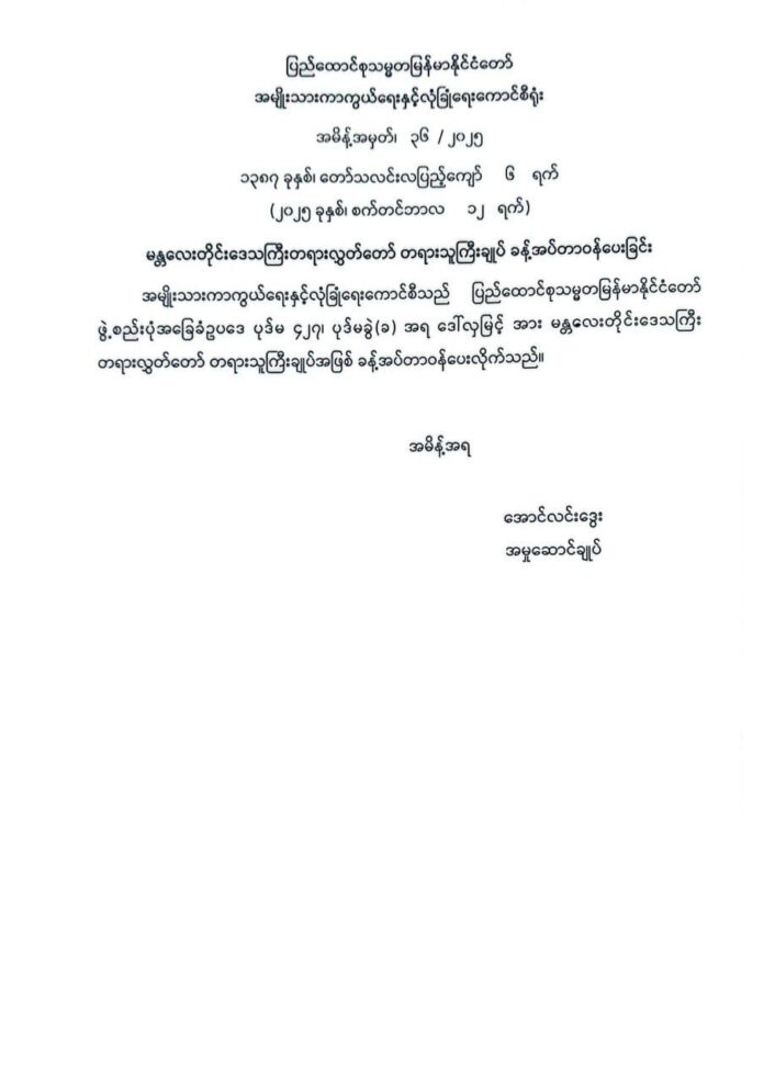ဖွဲ့စည်းပုံအခြေခံဥပဒေပုဒ်မ ၄၂၇ ပုဒ်မခွဲ(ခ)အရ ခန့်အပ်တာဝန်ပေးအပ်ခြင်းလည်း ဖြစ်ကြောင်း သိရသည်။