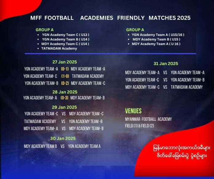 အဆိုပါ မြန်မာဘောလုံးအကယ်ဒမီများဖိတ်ခေါ်ခြေစမ်းပွဲ(၂၀၂၅)၏ အုပ်စုပွဲစဥ်များအား ဇန်နဝါရီ ၂၉ ရက်(မနက်ဖြန်)နှင့် ဇန်နဝါရီ ၃၀ ရက်၊ ဇန် နဝါရီ ၃၁ ရက်တို့တွင် ဆက်လက်ကျင်းပသွားမည်ဖြစ်သည်။