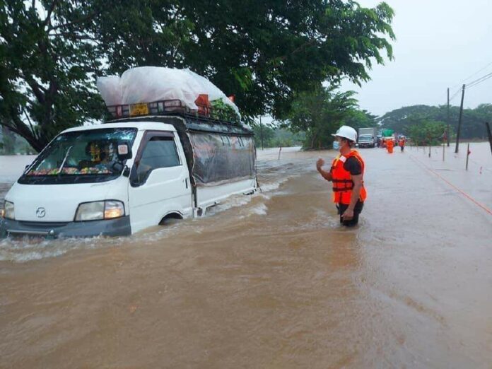 မုဒုံ-သံဖြူဇရပ်သွား ကားလမ်းပေါ်ရှိ နှီးပဒေါတံတားအနီး၌ ကားလမ်းရေကျော်နေ