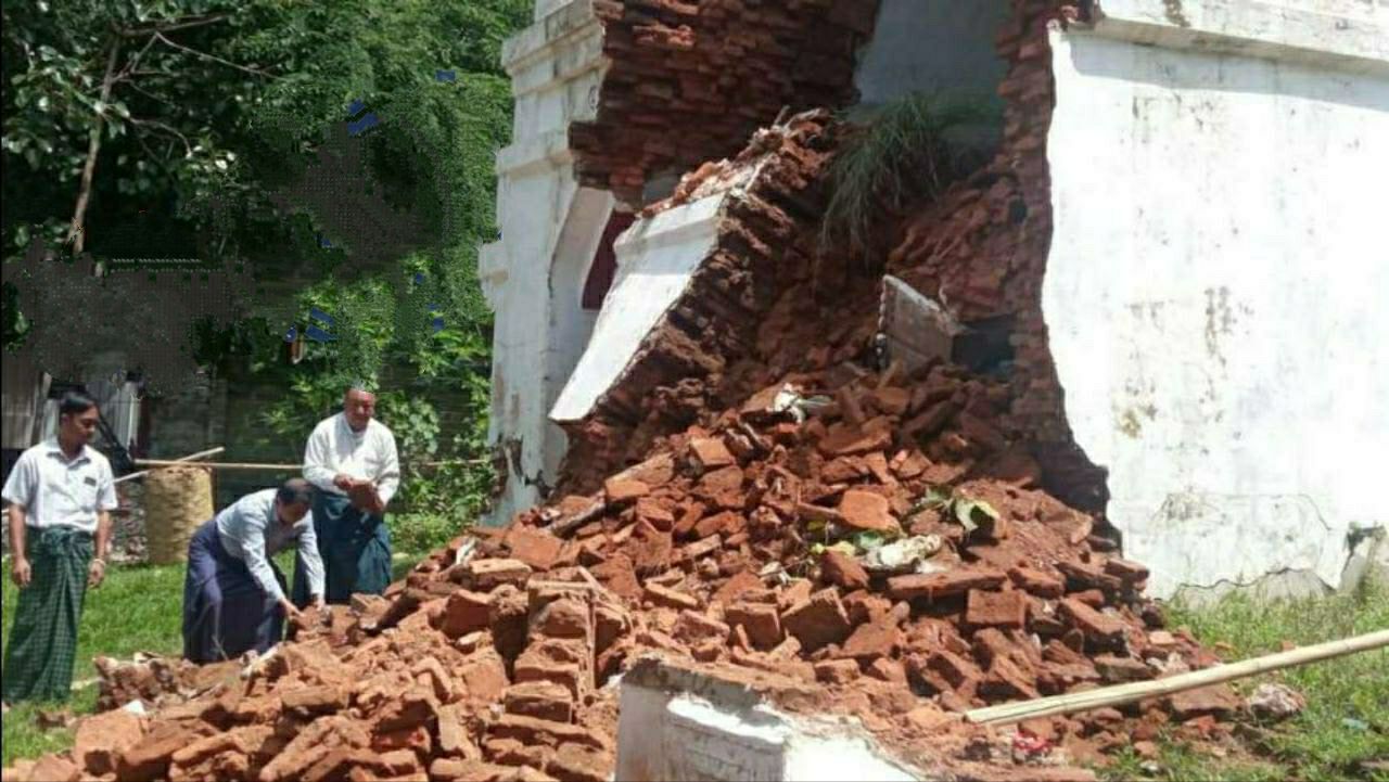 မြင်းခြံမြို့တွင် မိုးသည်းထန်စွာရွာသွန်း၍ ရွှေသာလျောင်းဘုရား၏ အဆောက်အဦးပြိုကျခဲ့