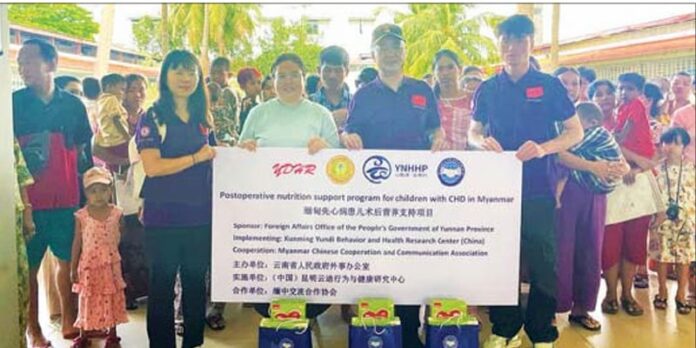 နှစ်နိုင်ငံချစ်ကြည်ရေး အစီအစဉ်အဖြစ် ယူနန်ပြည်နယ် နိုင် ငံခြားရေးဌာန မှ ထောက်ပံလှုဒါန်းပြီး မြန်မာ-တရုတ်ပူးပေါ င်းဆက်ဆံရေးအသင်း၏ ပူးပေါင်းပါဝင်ကူညီမှုဖြင့် ပြီးခဲ့သည့် အောက်တိုဘာ(၂၅)ရက်ကလည်း ရန်ကင်းကလေးဆေးရုံကြီးမှ ကုသနေသည့် အသက်(၆)လမှ (၉)နှစ် အရွယ် မွေးရာပါ နှလုံးရောဂါလူနာကလေးငယ် (၁)ဦးချင်စီကိုလ ည်း (၃)လစာ ဖြည့်စွက်စာအာဟာရများ လှူဒါန်းခဲ့ကြောင်း သိရသည်။