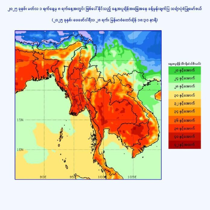 အဆိုပါ မတ် ၁ ရက်မှ မတ် ၈ ရက်အတွင်း ရန်ကုန်တိုင်း၊ ပဲခူးတိုင်း(တောင်ပိုင်း)၊ ဧရာဝတီတိုင်းနှင့် ရှမ်းပြည်နယ်(တောင်ပိုင်း)တို့တွင် မတ်လ၏ ပုံမှန်နေ့အပူချိန်ထက် (၅)ဒီဂရီဆဲလ်စီးယပ်ခန့်၊ စစ်ကိုင်းတိုင်း(အထက်ပိုင်း)၊ ပဲခူးတိုင်း (အရှေ့ပိုင်း)နှင့် ကချင်ပြည်နယ်(အောက်ပိုင်း)တို့တွင် မတ်လ၏ ပုံမှန်နေ့အပူချိန်ထက် (၆)ဒီဂရီဆဲလ်စီးယပ်ခန့်မြင့်တက်လာနိုင်ကြောင်း သိရသည်။