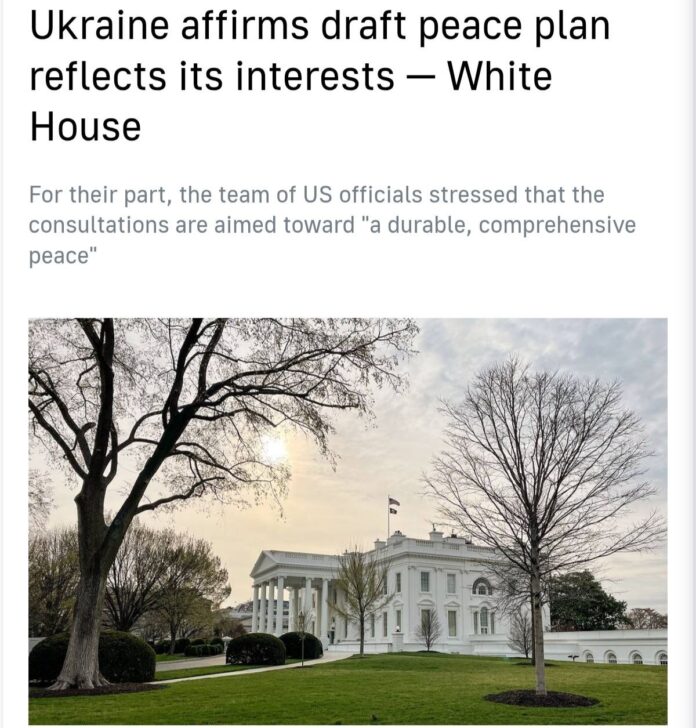 ယူကရိန်းနိုင်ငံအတွက် ရေးဆွဲထားသော နောက်ဆုံးပေါ် ငြိမ်းချမ်းရေးမူကြမ်းသည် ယူကရိန်းနိုင်ငံ၏ အမျိုးသားအကျိုးစီးပွားများကို ထင်ဟပ်နေသည်ဟု ဂျီနီဗာငြိမ်းချမ်းရေးဆွေးနွေးပွဲများ၌ ယူကရိန်းကိုယ်စားလှယ်အဖွဲ့က အတည်ပြုခဲ့ကြောင်း အိမ်ဖြူတော်က ဆွစ်ဇာလန်တွင် ပြုလုပ်သည့် အစည်းအဝေး၏ မှတ်တမ်းအကျဉ်းချုပ်၌ ဖော်ပြခဲ့သည်။