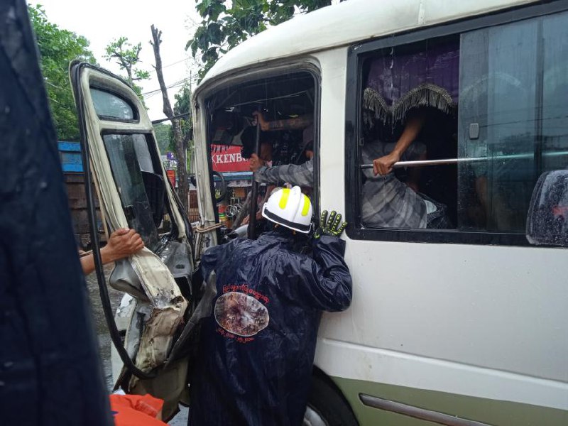 ရန်ကုန်-ပြည်လမ်းတွင် သဲတင်ယာဉ်နှင့် YBS ယာဉ်တို့ တိုက်မိပြီး YBS ယာဉ်မောင်း ထိခိုက်ဒဏ်ရာရ