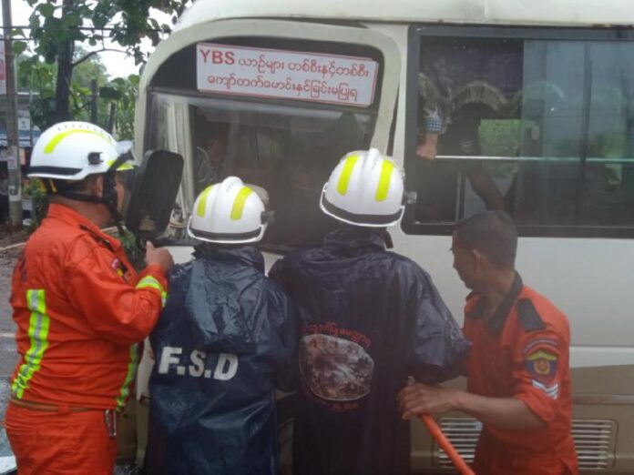 ရန်ကုန်-ပြည်လမ်းတွင် သဲတင်ယာဉ်နှင့် YBS ယာဉ်တို့ တိုက်မိပြီး YBS ယာဉ်မောင်း ထိခိုက်ဒဏ်ရာရရှိခဲ့ကြောင်း မြန်မာနိုင်ငံမီးသတ်တပ်ဖွဲ့မှ သိရသည်။