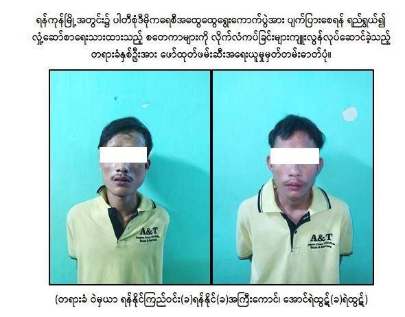 ပြစ်မှုကျုးလွန်သူများသည့် လှိုင်သာယာအရှေ့ပိုင်းမြို့နယ် အမှတ်(၆)ရပ်ကွက်တွင် နေထိုင်သည့် အောင်ရဲထွဋ်(ခ)ရဲထွဋ် နှင့် ရန်နိုင်ကြည်ဝင်း(ခ)အကြီးကောင်တို့ကို စက်တင်ဘာ (၁၈)ရက်တွင် ဖမ်းဆီးရမိခဲ့ကြောင်း သိရသည်။