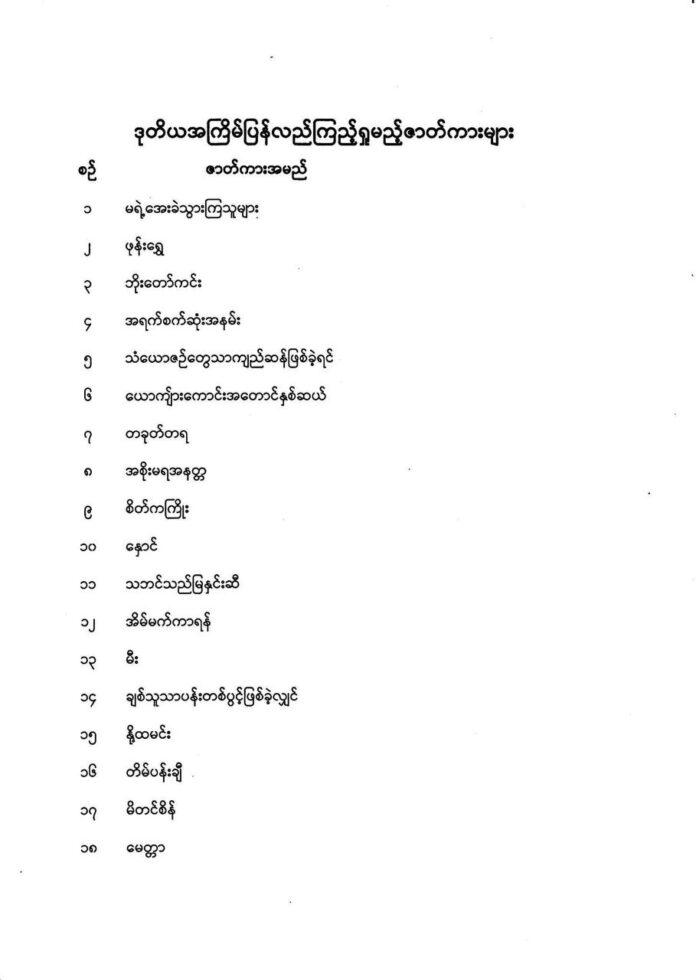 ဒုတိယအကြိမ် အကဲဖြတ်ပြီး ပြန်လည်ကြည့်ရှုမည့် ဇာတ်ကားများသည် (၁)မရဲ့အေးခဲသွားကြသူများ၊ (၂)ဖုန်းရွှေ၊(၃)ဘိုးတော်ကင်း၊ (၄) အရက်စက်ဆုံးအနမ်း၊(၅)သံယောဇဉ်တွေသာ ကျ-ည်ဆန်ဖြစ်ခဲ့ရင်၊ (၆) ယောက်ကျားကောင်း အတောင်နှစ်ဆယ်၊(၇)တခုတ်တရ၊ (၈)အစိုးမရ အနတ္တ၊(၉) စိတ်ကကြိုး၊ (၁၀)နှောင်၊ (၁၁)သဘင်သည် မြနှင်းဆီ၊ (၁၂) အိပ်မက်ကာရန်၊ (၁၃)မီး၊ (၁၄)ချစ်သူသည်သာ ပန်းတစ်ပွင့်ဖြစ်လျှင်၊ (၁၅) နို့ထမင်း၊ (၁၆)တိမ်ပန်းချီ၊ (၁၇)မိတင်စိန်၊(၁၈)မေတ္တာ ဆိုသည့် ဇာတ်ကားများ ဖြစ်ကြသည်။