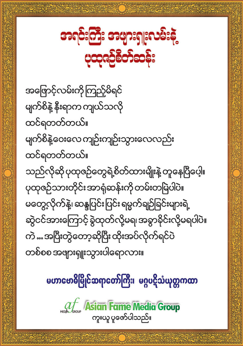 HomeDhammaDhamma Quotesအရင္းၾကီး အဖ်ားရွဴးလမ္းနဲ႔ ပုထုဇဥ္စိတ္ဆန္း အရင္းၾကီး အဖ်ားရွဴးလမ္းနဲ႔ ပုထုဇဥ္စိတ္ဆန္း Written by Popular December 20, 2016 Estimated reading time: Less than 1 minutes FacebookInstagramTwitter Local News ယနေ့ မင်္ဂလာတောင်ညွှန့် နေအိမ်တိုက်ခန်းမီးလောင်မှုဖြစ်စဥ်၌ မွေးကင်းစကလေးငယ် ၁ ဦးအပါအဝင် ၅ ဦးမီးခိုးမွှန်၍ ဆေးရုံပို့ခဲ့ရ Popular - Local News ကောလင်းနှင့် ဘုတလင်တွင် လက်နက်ကိုင်အဖွဲ့များ၏ လက်နက်ကြီးဖြင့် ပစ်ခတ်မှုကြောင့် ကိုရင် (၂)ပါးနှင့် ကလေးငယ်(၂)ဦး ဒဏ်ရာရ Popular - Local News ပုဂ္ဂလိကဆေးရုံအသစ်များ လိုင်စင်ချပေးရန် ကွင်းဆင်းစစ်ဆေးနေဟု ကျန်းမာရေးဝန်ကြီးပြော Popular - Local News ဖိလစ်ပိုင်နိုင်ငံတွင် လူကုန်ကူးခံရသည့် မြန်မာနိုင်ငံသား (၂၁) ဦးအနက် ပထမအသုတ်အဖြစ် (၄)ဦးအား ပြန်လည်ပို့ဆောင် Popular - Load more Ads Space Available Boost your brand’s visibility with prime ad space on our website—reach your audience effectively and drive results! Call Us at: 09-420209071 Contact Us ဆီးဂိမ်းပြိုင်ပွဲတွင် အမိနိုင်ငံအတွက် ရွှေတံဆိပ်ဆုများ ဆွတ်ခူးရယူပေးနိုင်သည့် အားကစားသမားကောင်းများဖြစ်အောင် ကြိုးစားရန် ပြည်ထောင်စုဝန်ကြီး Jeng Phang... Popular Journal - December 5, 2025 Local News ဆီးဂိမ်းပြိုင်ပွဲတွင် အမိနိုင်ငံအတွက် ရွှေတံဆိပ်ဆုများ ဆွတ်ခူးရယူပေးနိုင်သည့် အားကစားသမားကောင်းများဖြစ်အောင် ကြိုးစားရန် ပြည်ထောင်စုဝန်ကြီး Jeng Phang နော်တောင် တိုက်တွန်း Popular Journal - Local News အရှေ့တောင်အာရှ မူလတန်းပညာသင်ယူမှုတိုင်းတာစစ်ဆေးစံ၏ ဒေသဆိုင်ရာ သုတေသနအစီရင်ခံစာ ထုတ်ပြန်ခြင်း အခမ်းအနားကို ပညာရေးဝန်ကြီးဌာန တက်ရောက် Popular Journal - Local News တရုတ်နိုင်ငံသား(၂၇၈)ဦးကိုပြည်နှင်လွှဲပြောင်းပေးပြီး (၂၄၈)ဦးကို ထပ်မံထိန်းသိမ်း Popular Journal - Local News ရုရှား-မြန်မာပူးပေါင်းဆောင်ရွက်မည့် သဘာဝမြေဩဇာစက်ရုံတည်ဆောက်ရေးလုပ်ငန်းအား ဒီဇင်ဘာလတွင် စတင်နိုင်ရေး ဆွေးနွေး Popular Journal - Continue reading Popular - February 15, 2023 Local Newsယနေ့ မင်္ဂလာတောင်ညွှန့် နေအိမ်တိုက်ခန်းမီးလောင်မှုဖြစ်စဥ်၌ မွေးကင်းစကလေးငယ် ၁ ဦးအပါအဝင် ၅ ဦးမီးခိုးမွှန်၍ ဆေးရုံပို့ခဲ့ရ ရန်ကုန်တိုင်း၊ မင်္ဂလာတောင်ညွှန့်မြို့နယ်၊ ရေတွင်းကုန်းရပ်ကွက်ရှိ နေအိမ်တိုက်ခန်းတစ်ခု၏ ဒုတိယထပ်တွင် ဖေဖော်ဝါရီ ၁၅ ရက်(ယနေ့)မွန်းလွဲပိုင်းက Level 1 အဆင့်မီးလောင်မှုဖြစ်စဥ်တွင် မွေး ကင်းစကလေးငယ် ၁ ဦးအပါအဝင် ၅ ဦးမီုးခိုးမွှန်သွား၍ ဆေးရုံသို့ပို့ဆောင်ပေးခဲ့ရကြောင်း သိရသည်။ ယနေ့မွန်းလွဲ ၂ နာရီ ၅၀ မိနစ်ခန့်က မင်္ဂလာတောင်ညွန့်မြို့နယ်၊ ရေတွင်းကုန်းရပ်ကွက်၊ (၁၂၂)လမ်း ၏ နေအိမ်တိုက်ခန်းတစ်ခု၏ဒုတိယထပ်ရှိ လျှပ်စစ်ပစ္စည်းဆိုင်မှ မီးစတင်လောင်ကျွမ်းခဲ့ခြင်းဖြစ် သည်။ မီးလောင်မှုအား တာမွေမြို့နယ်မီးသတ်စခန်း၊ မင်္ဂလာတောင်ညွန့်မြို့နယ်မီးသတ်စခန်းတို့မှတပ်ဖွဲ့ဝင်များနှင့် လူမှုကူညီရေးအသင်းများက Level 1 အဆင့်ဖြင့် ဝိုင်းဝန်းငြှိမ်းသတ်ခဲ့ကြသ