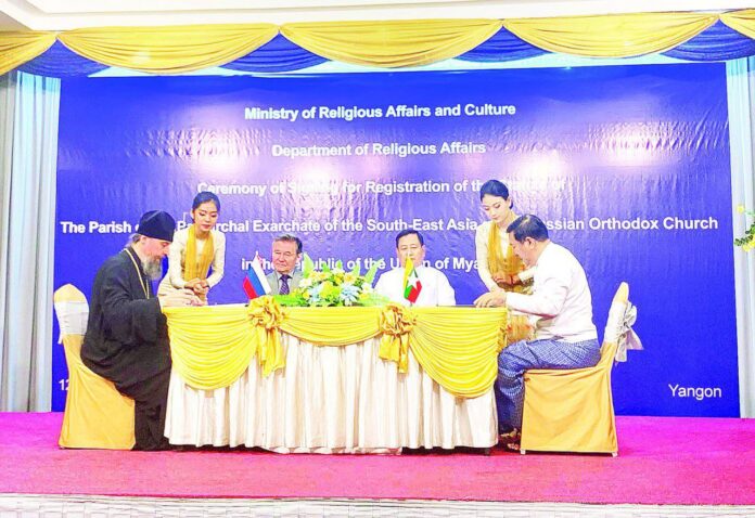 သာသနာရေးလုပ်ငန်းဆောင်ရွက်ခွင့်ပြုခြင်းဆိုင်ရာသဘောတူစာချုပ် (LOA)နှင့်အညီ “အရှေ့တောင်အာရှဆိုင်ရာ ရုရှား အော်သိုဒေါ့ ခရစ်ယာန်အသင်းတော်၏ မြန်မာနိုင်ငံဆိုင်ရာ အသင်းတော်စည်းမျဉ်း (Statute)”အား မှတ်တမ်းတင်လက်ခံထားရှိကြောင်း သာသနာရေးဦးစီးဌာန ညွှန်ကြားရေးမှူးချုပ် နှင့် ဘုန်းတော်ကြီး His Eminence SERGIY တို့က လက်မှတ်ရေးထိုးခဲ့ကြခြင်းဖြစ်သည်။