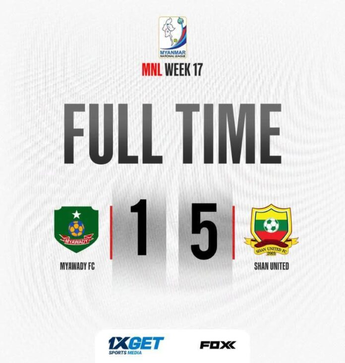 အုပ်စုပထမအဆင့် ရှမ်းယူနိုက်တက်၏ နောက်ဆုံးပွဲစဉ် ယှဉ်ပြိုင်ကစားမှု မြဝတီအသင်းကို (၅)ဂိုးပြတ်ဖြင့် အနိုင်ရလဒ်ထွက်ပေါ်