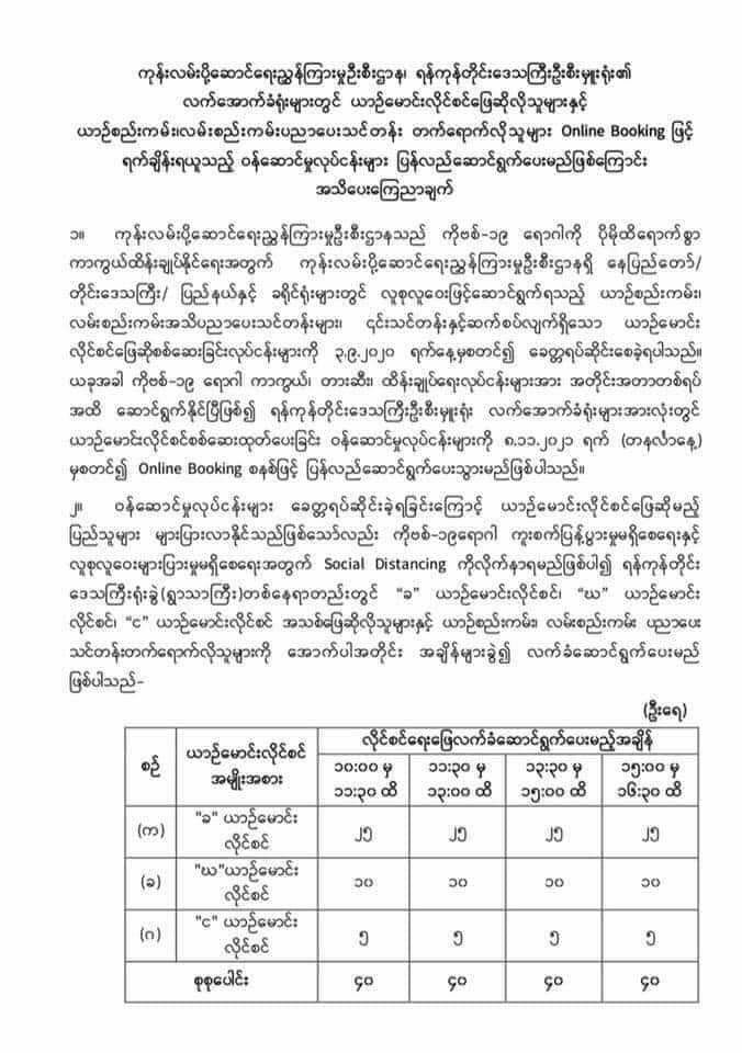 ဒါ့အပြင်အခြား ကညန ရုံးအသီးသီးမှာလည်း ယာဥ်မောင်းလိုင်စင်စစ်ဆေးထုတ်ပေးတာတွေကို အဲဒီနေ့မှာပဲ Online Booking စနစ်နဲ့စတင်ဆောင်ရွက်ပေးသွားမှာလည်းဖြစ်ပါတယ်။