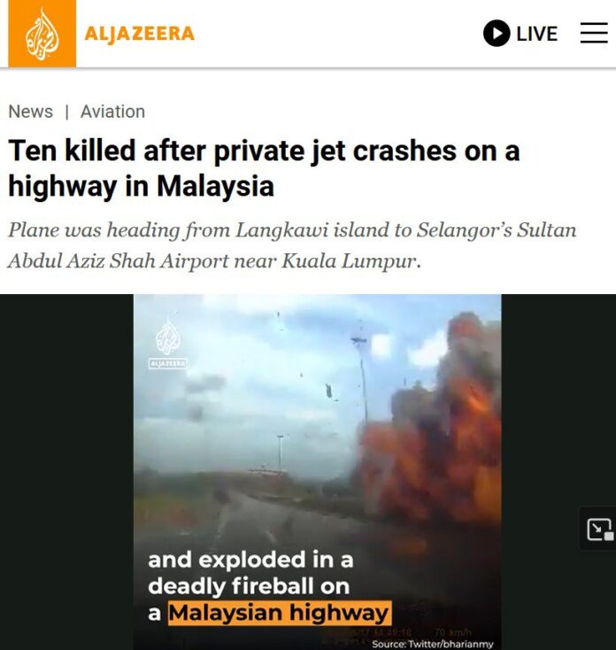 မလေးရှားနိုင်ငံ အဝေးပြေးလမ်းမပေါ်တွင် ကိုယ်ပိုင်ဂျက်လေယာဉ်တစ်စင်း ပျက်ကျမှုကြောင့် လူ ၁၀ ဦး သေဆုံး