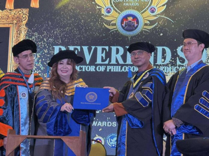 စစ်ကိုင်းတိုင်း၊ စစ်ကိုင်းတောင်ရိုးပေါ်ရှိ အပြည်ပြည်ဆိုင်ရာဗုဒ္ဓဘာသာပညာရေးစင်တာ၏ IBEC ဆရာတော်အား ဖိလစ်ပိုင်နိုင်ငံ၊ မနီလာမြို့အခြေစိုက် Asian University International မှ ပညာရေးဆိုင်ရာစီမံခန့်ခွဲမှုဂုဏ်ထူးဆောင်ပါရဂူဘွဲ့ကို ယနေ့ သြဂုတ် ၁၆ ရက်က မနီလာမြို့ရှိ၊ Heritage Hotel၊ The Grand Ballroom ခန်းမတွင်ချီးမြှင့်အပ်နှင်းခဲ့သည်။