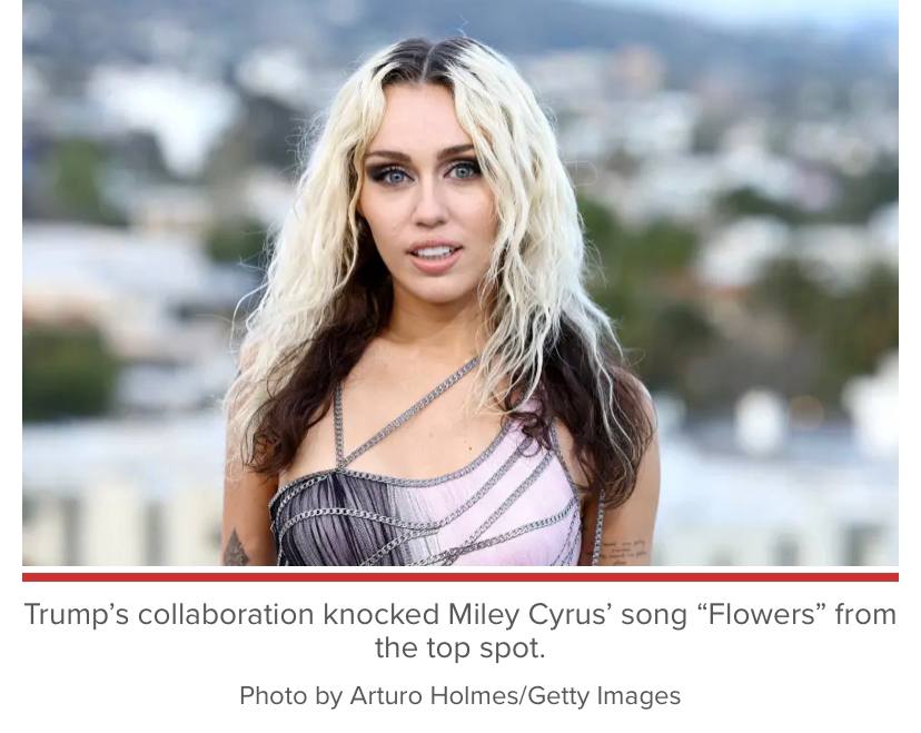 အမေရိကန် သမ္မတဟောင်း ဒေါ်နယ် ထရမ့် သီဆိုထားတဲ့ “Justice For All” ဆိုတဲ့ သီချင်းဟာ သီချင်းနားထောင်တဲ့ iTunes အက်ပလီကေးရှင်းမှာ နားဆင်မှု အများဆုံး သီချင်း ဖြစ်လာတယ်လို့ သိရပါတယ်။ ပြီးခဲ့တဲ့အပတ် စနေ၊ တနင်္ဂနွေနေ့အတွင်း နာမည်ကျော် ပေါ့အဆိုတော် မိုင်လီဆိုင်းရပ်စ်ရဲ့ခေတ်ထနေတဲ့ “Flowers” ဆိုတဲ့ သီချင်းကို ကျော်ပြီး နံပါတ် ၁ နေရာကို ရယူနိုင်ခဲ့တာပါ။