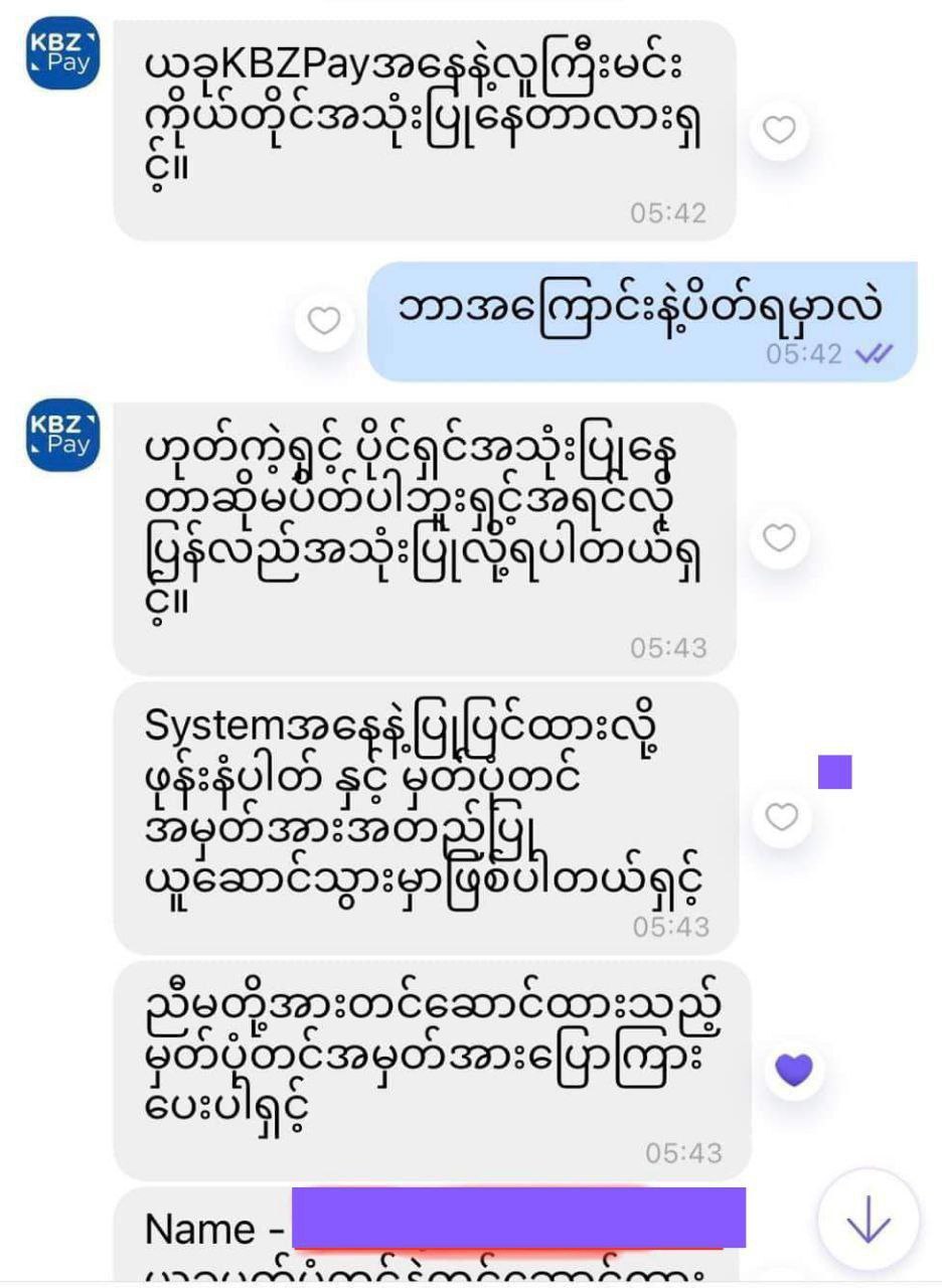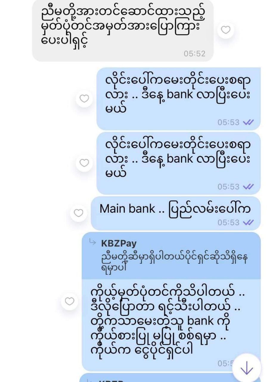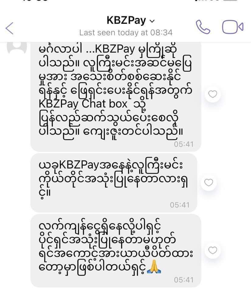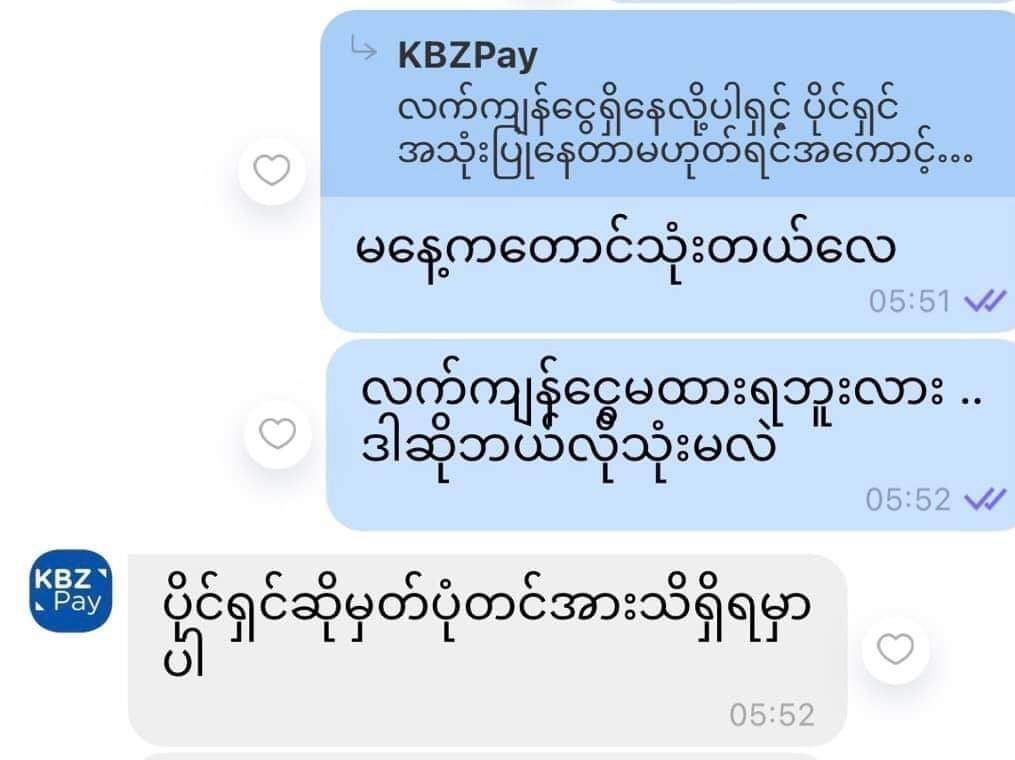 ၎င်းအနေဖြင့် Kpay အကောင့်မှ ငွေများ လိမ်လည်ခံရ‌သော်လည်း အကောင့်အတွင်း ငွေအများအပြား ထည့်သွင်းထားခြင်း မရှိသည့်အတွက် ၄၀၀၀၀ ကျပ်သာ ပါသွားကြောင်းလည်း ၎င်းက ဆိုသည်။
