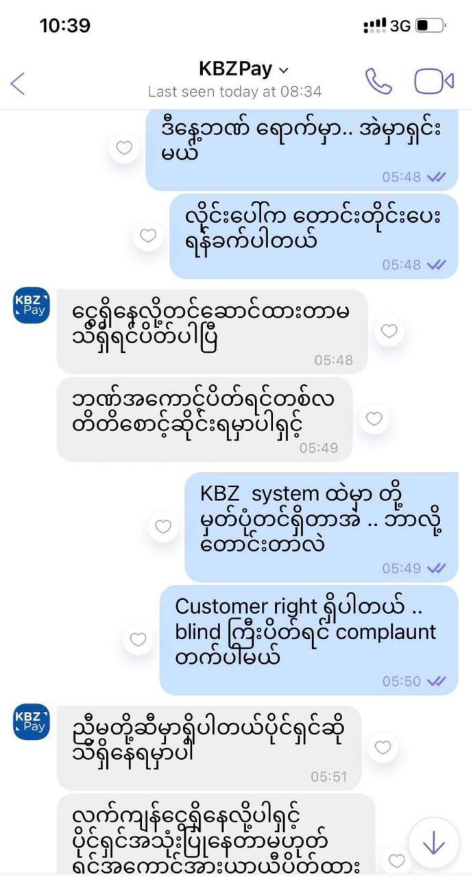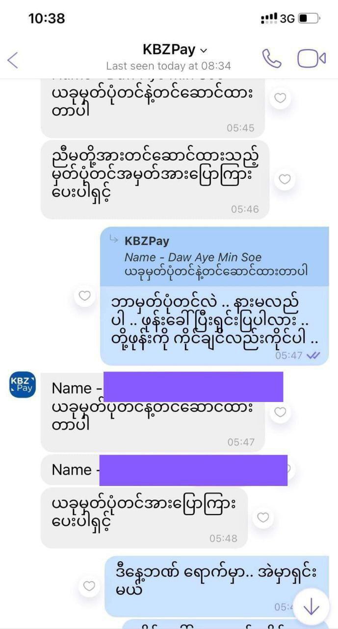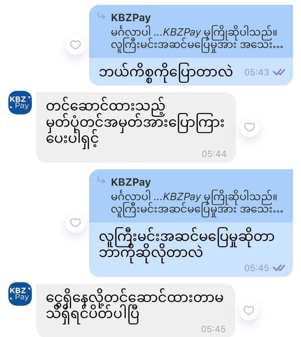 ၎င်းအနေဖြင့် Kpay အကောင့်မှ ငွေများ လိမ်လည်ခံရ‌သော်လည်း အကောင့်အတွင်း ငွေအများအပြား ထည့်သွင်းထားခြင်း မရှိသည့်အတွက် ၄၀၀၀၀ ကျပ်သာ ပါသွားကြောင်းလည်း ၎င်းက ဆိုသည်။