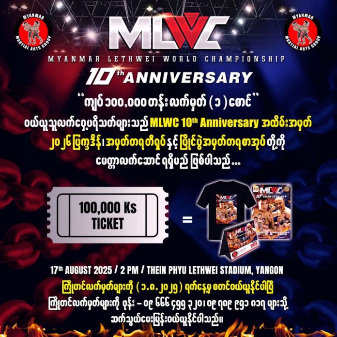 မြန်မာနိုင်ငံ၏ အကြီးကျယ်ဆုံး ရိုးရာလက်ဝှေ့ပြိုင်ပွဲ (Myanmar Lethwei World Championship)ကို ဩဂုတ်လ (၁၇) ရက် မွန်းလွဲ (၂) နာရီအချိန်၌ ရန်ကုန်မြို့သိမ်ဖြူရိုးရာလက်ဝှေ့အားကစားခန်းမတွင် ကျင်းပသွားမည်ဖြစ်သည်။