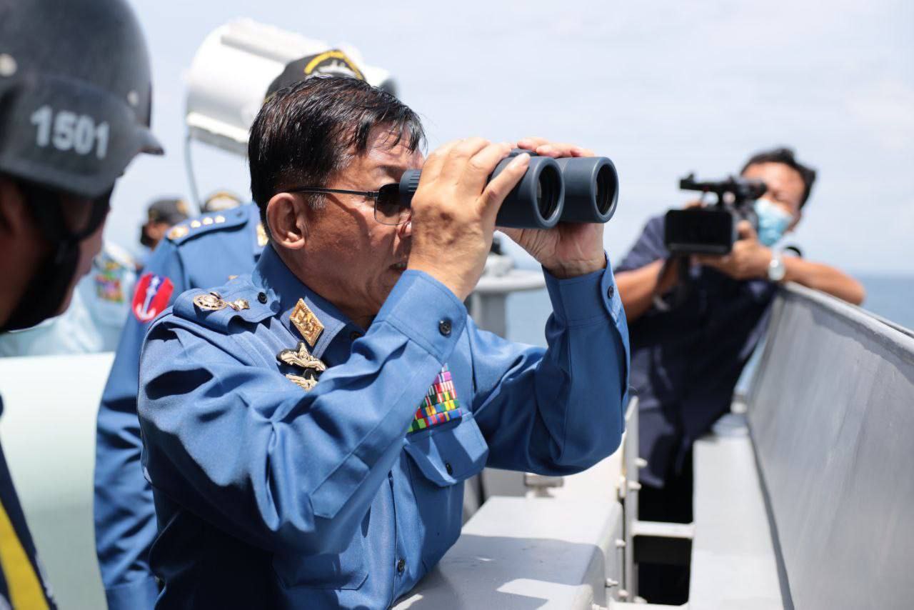 a Three Dimensional Combat Ready Navy on 5th July when he inspected  the naval exercises which took place in Rakhine Coastal Area on Myanmar Territorial Waters. The joint manoeuvres involved the combat submarines known as MV Minye Thein KhaThu and MV Minye Kyaw Htin inter alia in addition to the helicopters. This naval exercise is named Sea Shield-2022.