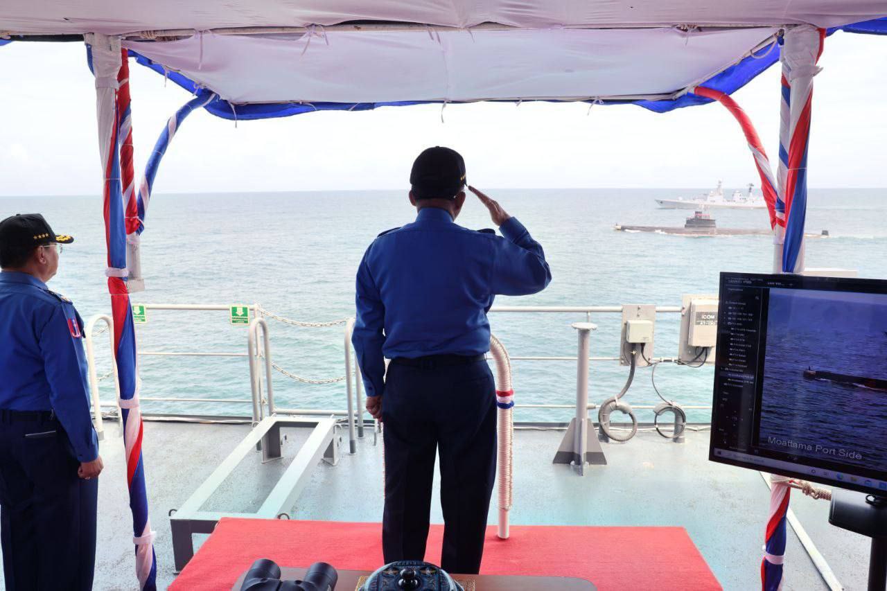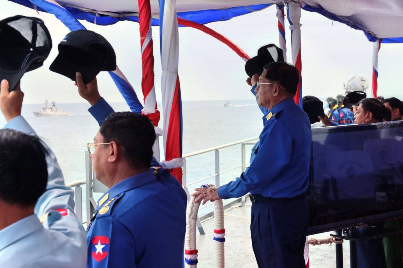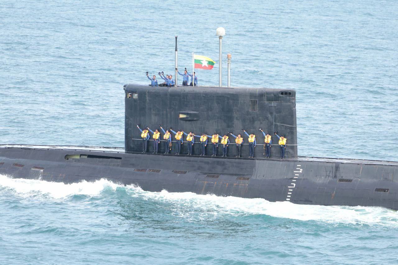 a Three Dimensional Combat Ready Navy on 5th July when he inspected  the naval exercises which took place in Rakhine Coastal Area on Myanmar Territorial Waters. The joint manoeuvres involved the combat submarines known as MV Minye Thein KhaThu and MV Minye Kyaw Htin inter alia in addition to the helicopters. This naval exercise is named Sea Shield-2022.