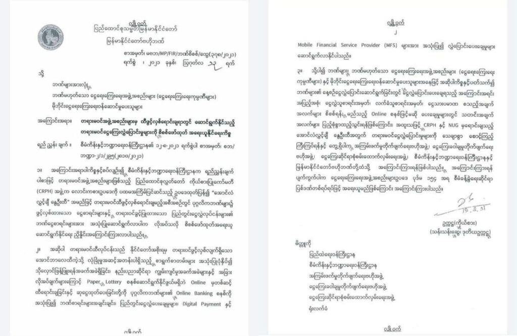 NUGက လောင်းကစားဥပဒေကို ပထမအကြိမ်ပြင်ဆင်၍ “အောင်လံလွှင့်ချီ နွေဦးထီ” အမည်ဖြင့် ထီဖွင့်လှစ်ရောင်းချမည့် အစီအစဉ်တွင် ပုဂ္ဂလိကဘဏ်များ မှငွေစာရင်းများနှင့် တရားဝင်ခွင့်ပြုထားသော ပြည်တွင်းငွေလွှဲ လုပ်ငန်းများ၏ ဘဏ်ငွေစာရင်းများအား အသုံးပြုဆောင်ရွက် လာပါက လိုအပ်သလို စိစစ်အရေးယူနိုင်ရေးညှိနှိင်းဆောင်ရွက်မည်ဖြစ်ကြောင်း မြန်မာနိုင်ငံဗဟိုဘဏ်မှ ထုတ်ပြန် အကြောင်းကြားထားသည်။
