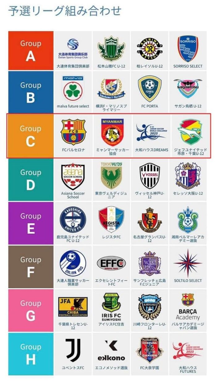 ဂျပန်နိုင်ငံ၊ ချီဘားမြို့တွင် လာမည့် သြဂုတ် ၂၄ ရက်မှ ၂၇ ရက်အထိ ကျင်းပပြုလုပ်မည့် ၁၁ ကြိမ်မြောက် U12 Junior Soccer World Challenge 2023 ပြိုင်ပွဲ သွားရောက်ယှဥ်ပြိုင်မည့် မြန်မာ့လက်ရွေးစင် ယူ – ၁၂ အသင်းသည် ဘာစီလိုနာအသင်းနှင့် တစ်အုပ်စုတည်း ကျရောက်နေကြောင်း သိရသည်။