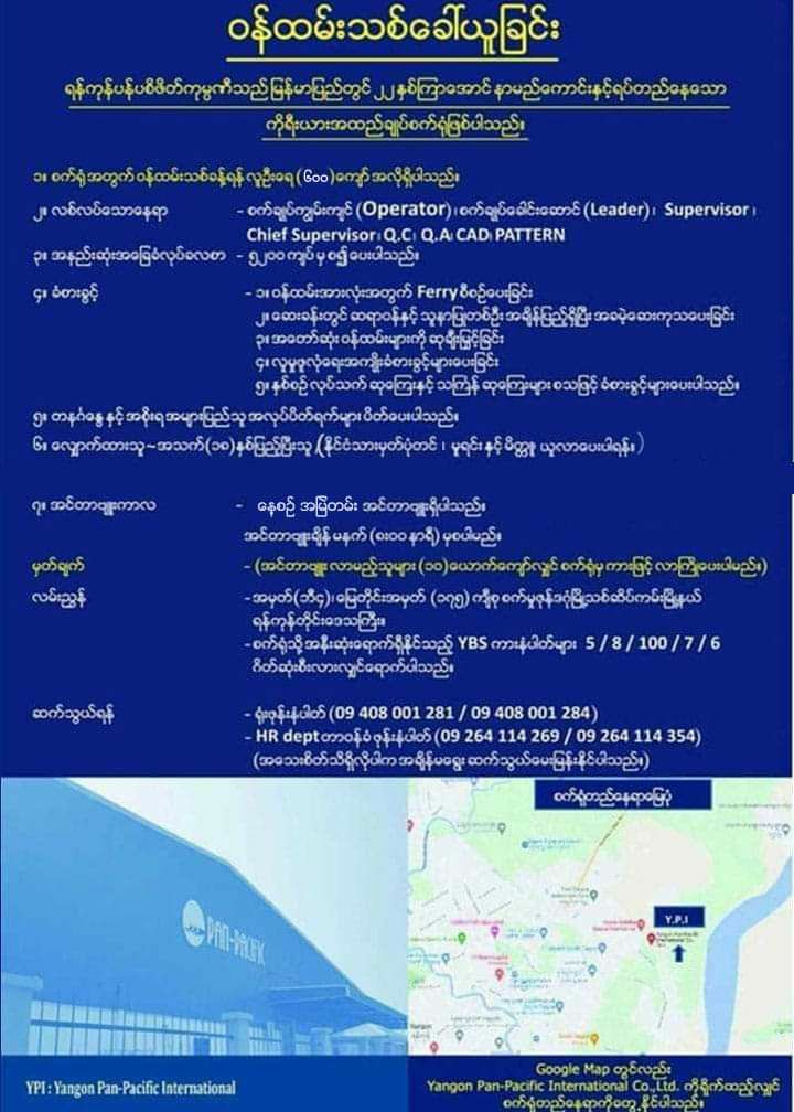 ရန်ကုန်မြို့၊ဒဂုံမြို့သစ်(ဆိပ်ကမ်း)မြို့နယ်၊ကျီစုစက်မှုဇုန်၊ကနောင်မင်းသားကြီးလမ်းရှိ ကိုရီးယားအထည်ချုပ်စက်ရုံဖြစ်သည့် Yangon Pan- Pacific International Co., LTD.( Y. P. I )မှ အ သက် ၁၈ နှစ်ပြည့်ပြီးသည့် အမျိုးသမီးဝန်ထမ်းအယောက် ၆၀၀ ကျော်ခေါ်ယူသွားမည်ဖြစ် ကြောင်း သိရသည်။